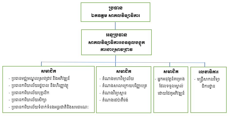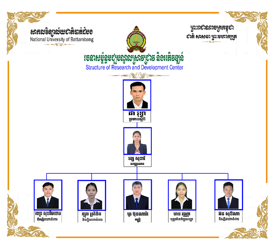 The Research and Development Center is currently led by Acting Director Mr. Da Vuthea, who is responsible for overall management. Deputy Director Ms. Vong Sokhavy is in charge of project management, and Mr. Bo Bunnara is responsible for general administrative work. The center operates under the direct supervision of Vice-Rector Mr. Tep Neavea.